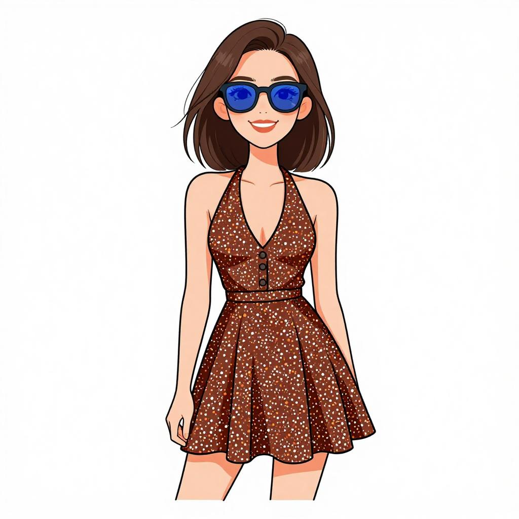 Illustration of a smiling woman with shoulder-length brown hair wearing a casual summer halter neck mini dress featuring an allover tiny speckled print in shades of brown, orange, and white. The dress has a deep V-neckline with button details down the center front and a gently flared skirt. She accessorizes with blue-tinted sunglasses, standing against a white backdrop.