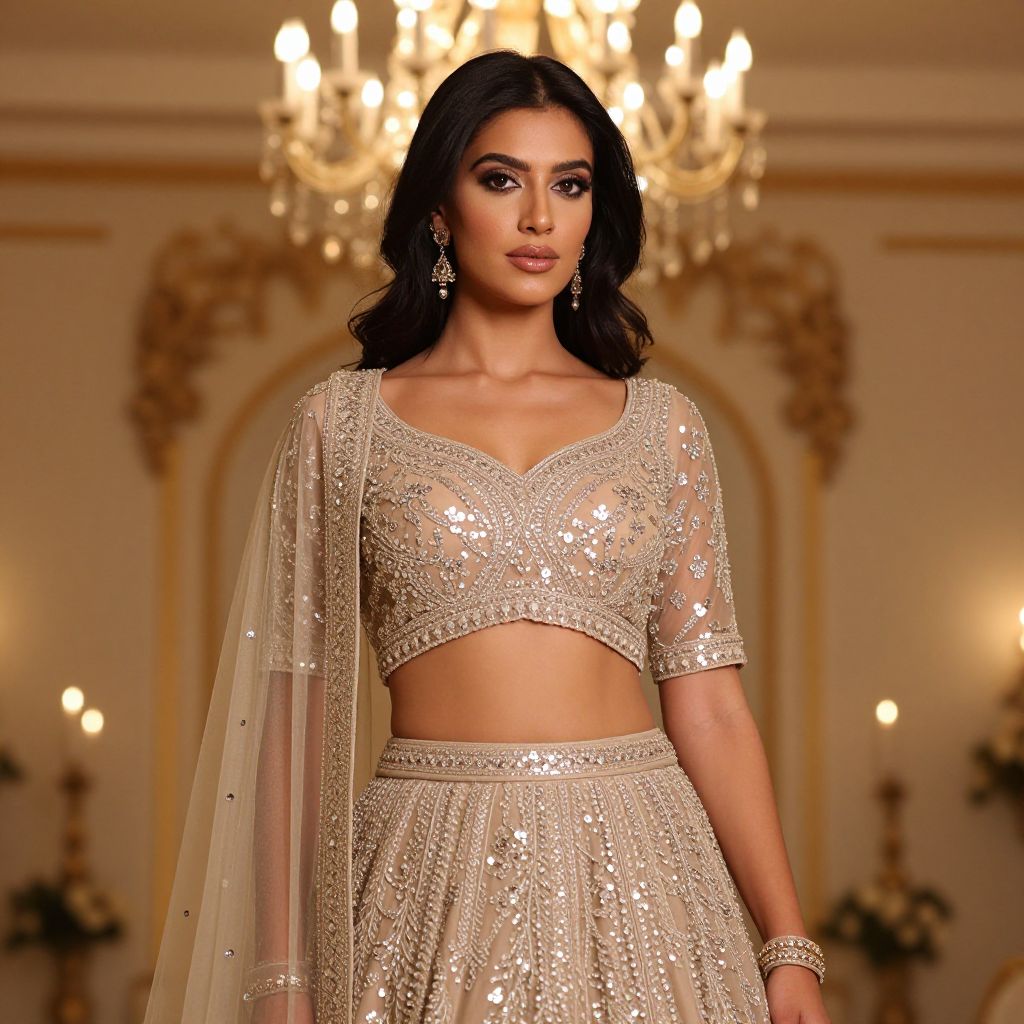 Photograph of a beautiful Indian woman with dark hair, wearing a sparkling, gold-embellished choli and lehenga set, standing in an