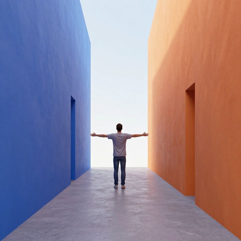 Minimalist 3D-rendered scene showing a person standing with arms outstretched between tall blue and orange walls. The smooth concrete pathway and natural light create a serene and balanced atmosphere in modern architectural setting.