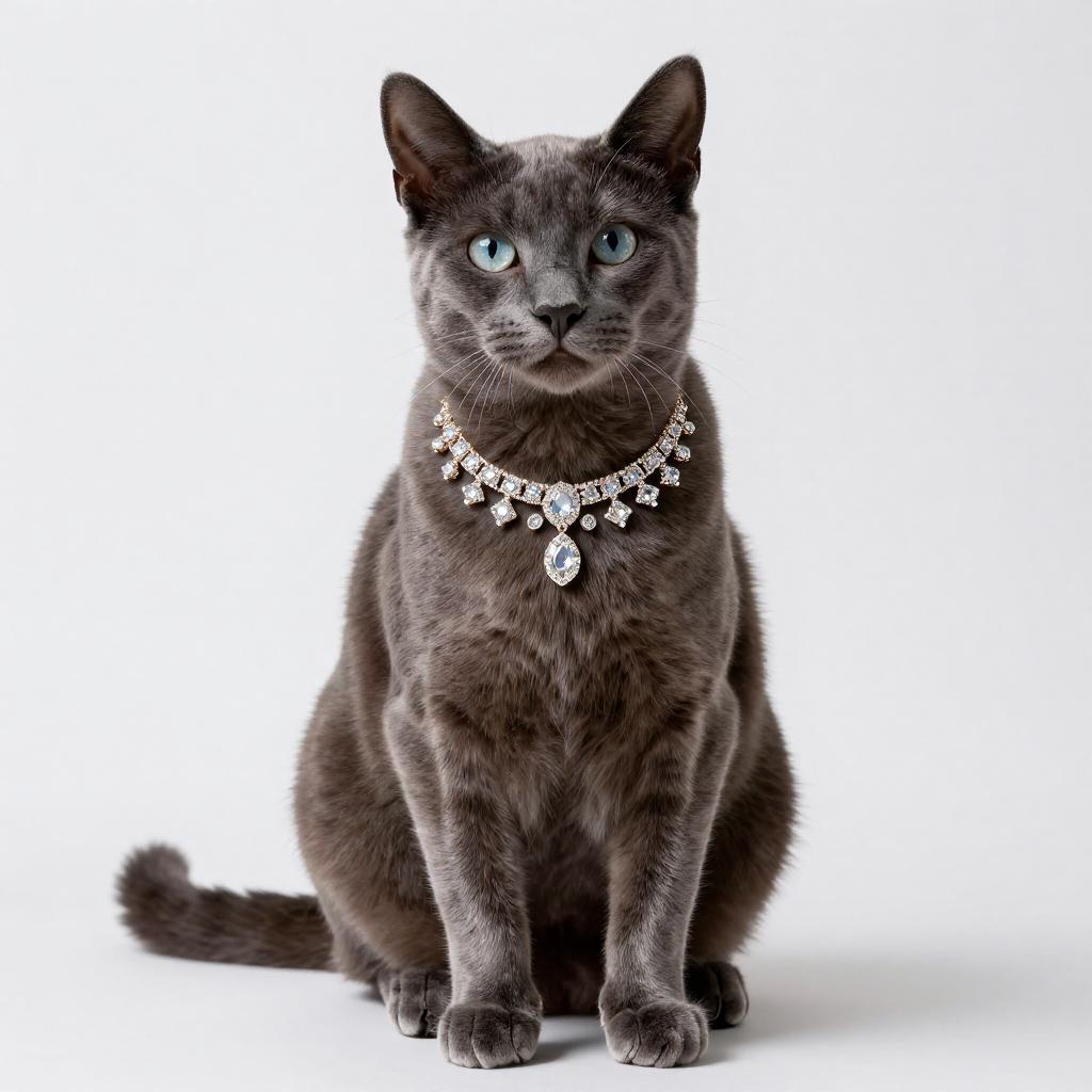 Luxurious studio portrait of a Russian Blue cat sitting upright, glossy dark fur, wearing an ornate sparkling diamond necklace, clean white background, high-end fashion pet photography, high resolution, ultra-detailed