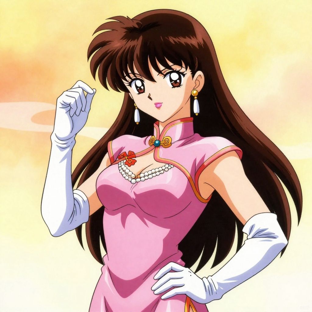Masterpiece, best quality, anime screencap, 1990s \(style\), maishiranui, 1girl, solo, bridal gauntlets, brown hair, china dress, chinese clothes, earrings, elbow gloves, jewelry, large breasts, lipstick, long hair, makeup, ponytail