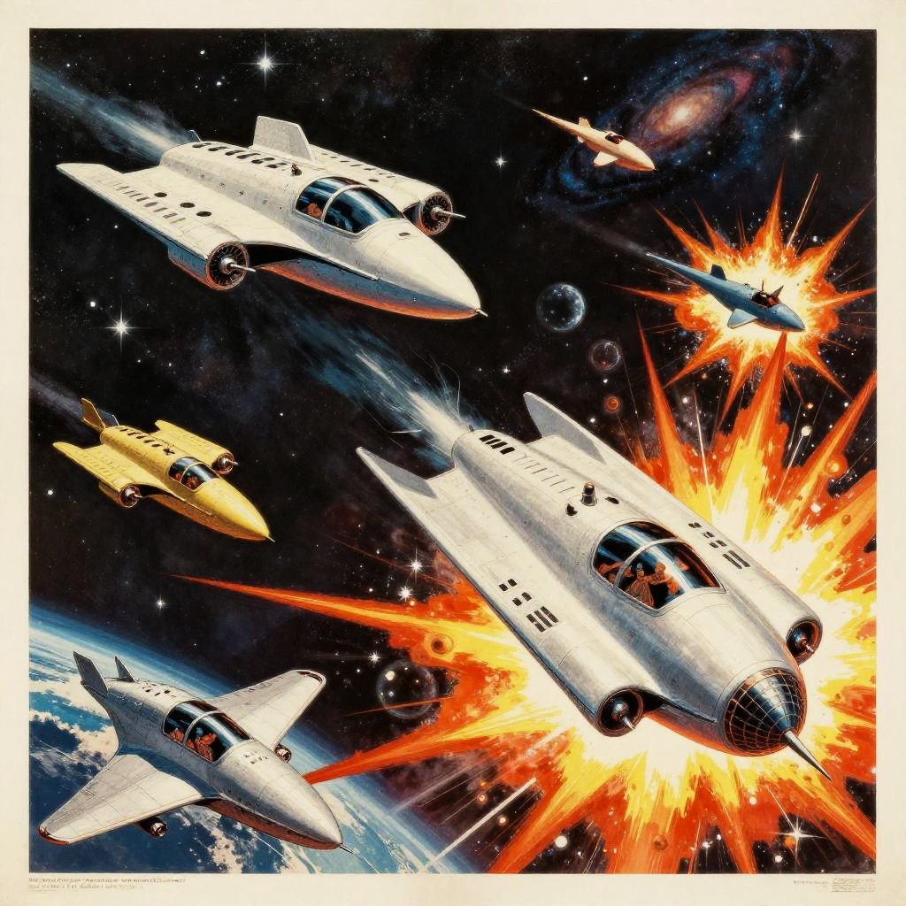 1950s space art of a cosmic battle between sleek starships in a star-studded galaxy, dramatic contrasts and bold color blocking, vintage pulp magazine cover style with expressive action and vibrant explosions, futuristic yet nostalgic mood