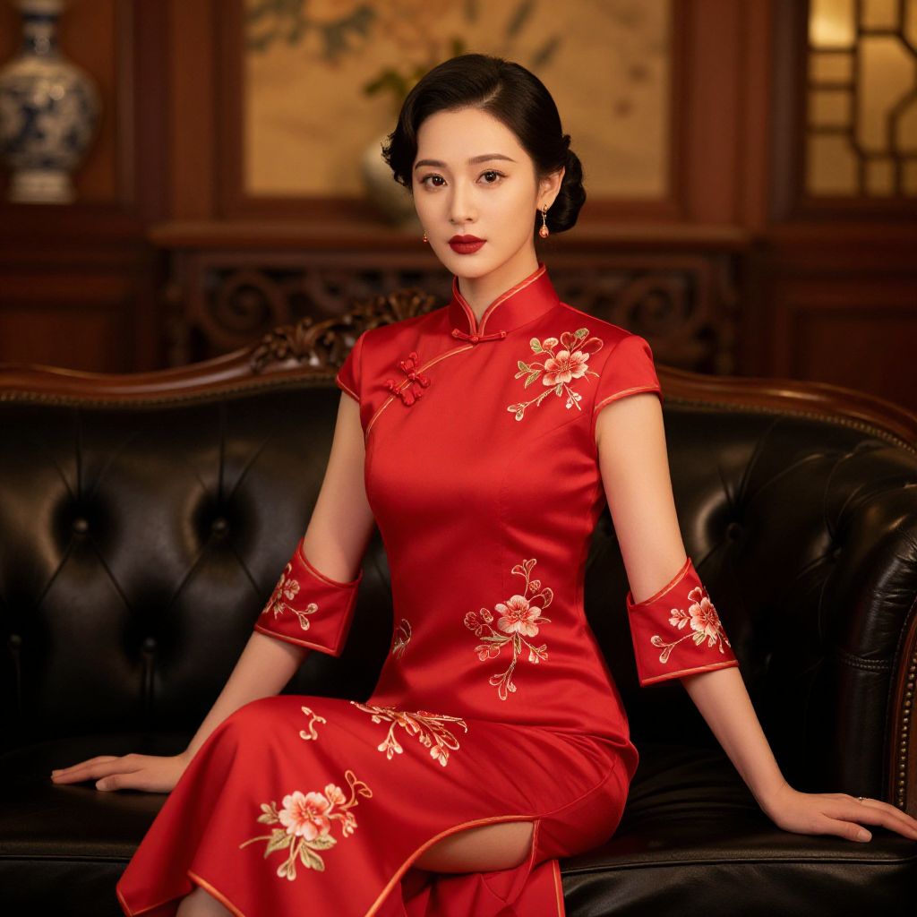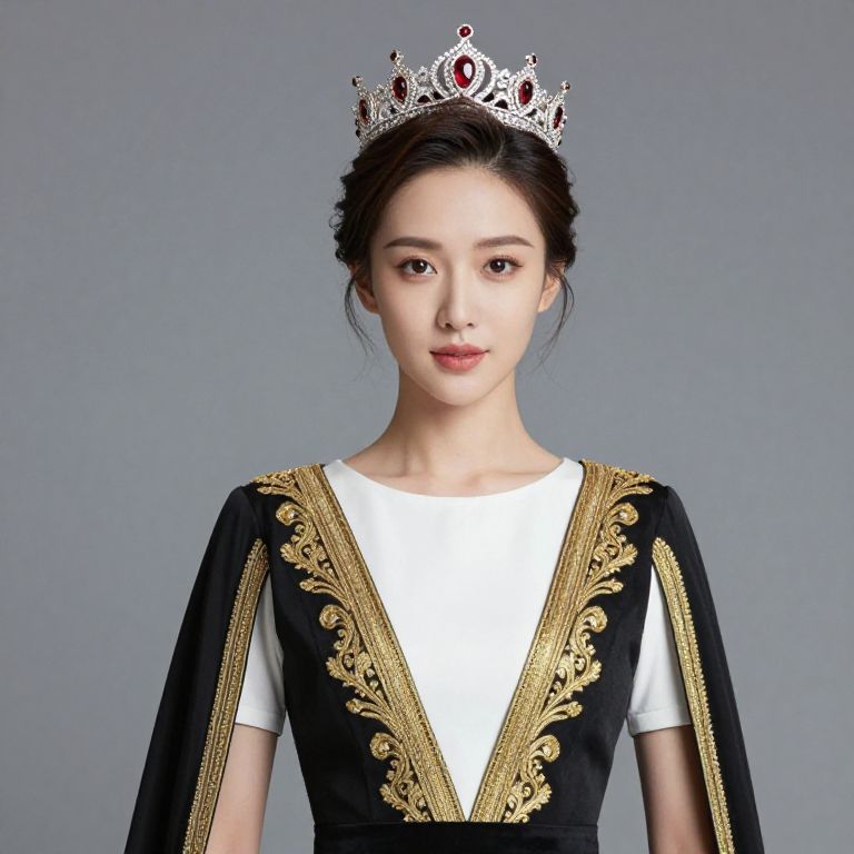 Female wearing a white dress with gold embroidery and a hat with feathers on top.