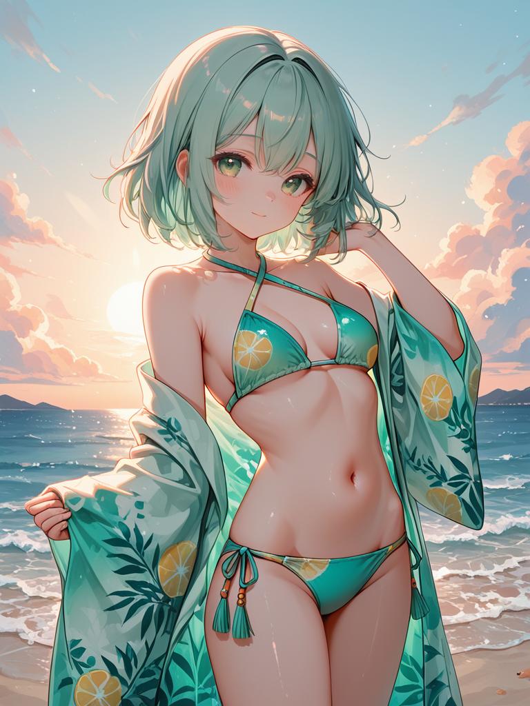 Anime Girl in Mint Green Bikini and Kimono on Beach