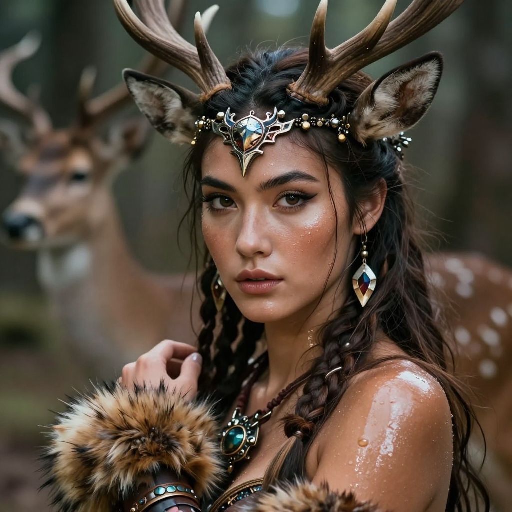 Photorealistic digital artwork of a young woman with dark, wavy hair and deer antlers adorned with a jeweled headpiece. She has glowing, olive-toned skin, large, dark eyes, and wears intricate, dangling earrings and a fur-trimmed garment. Her skin is slightly shiny, highlighting her features. In the blurred background, a deer stands in a forest. The woman's intense gaze and detailed, fantasy-inspired attire create a mystical, woodland atmosphere. The textures of her fur and jewelry contrast with the soft, natural forest setting.