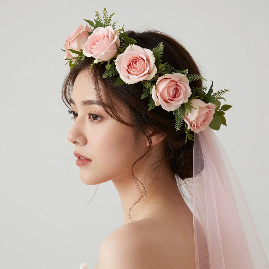 Photograph of an Asian woman with fair skin and dark, wavy hair, wearing a delicate pink rose and greenery crown with a translucent veil. Her face is softly lit, showing gentle makeup with a natural look. She gazes slightly to the right, with a calm and serene expression. The background is a stark white, which emphasizes her delicate features and floral headpiece. She is bare-shouldered, suggesting a bridal or ethereal theme. The roses have soft pink petals, adding a romantic and gentle touch to the composition.