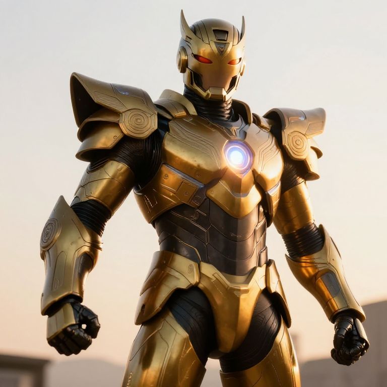 Super hero armor featuring gold and black plating, ancient warrior motifs blended with modern tech, glowing energy core on chest, heroic stance in sunrise light, fantasy and sci-fi fusion