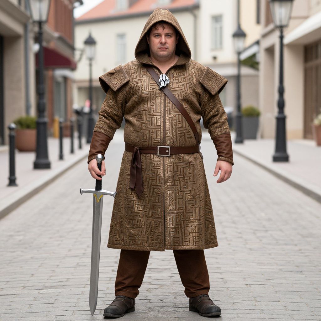 Photograph of a burly man in brown, patterned medieval cloak, hood up, holding a sword on a cobblestone street.