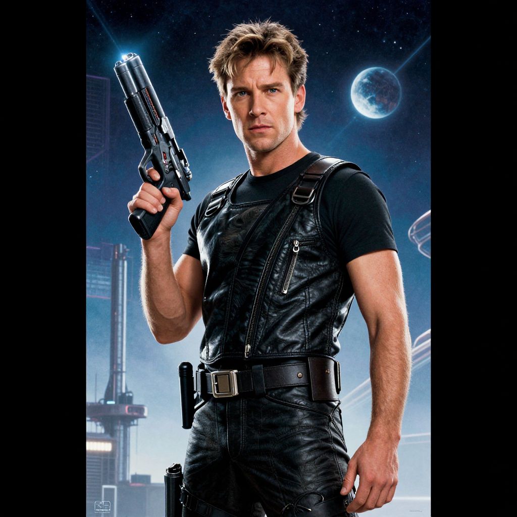 Photograph-style CGI of a muscular, serious-looking man in black leather tactical gear, holding a gun, set against a futuristic, space-themed background with
