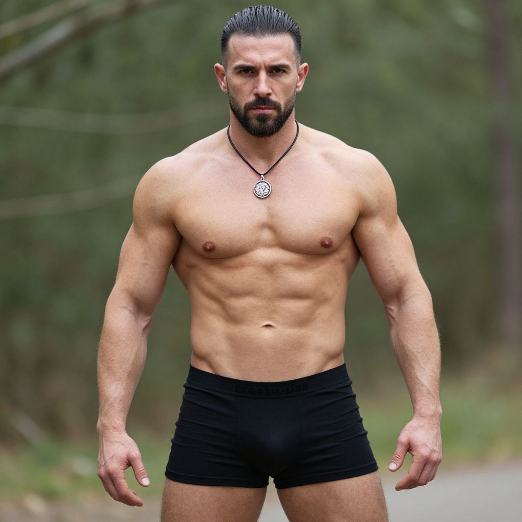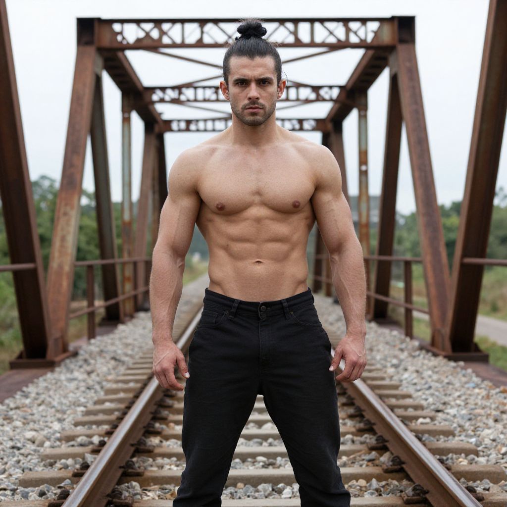 A muscular man with a top knot hairstyle stands confidently shirtless on railroad tracks beneath a rusted metal bridge. The outdoor setting features an industrial backdrop with a focus on fitness and strength, captured in a natural, moody style.