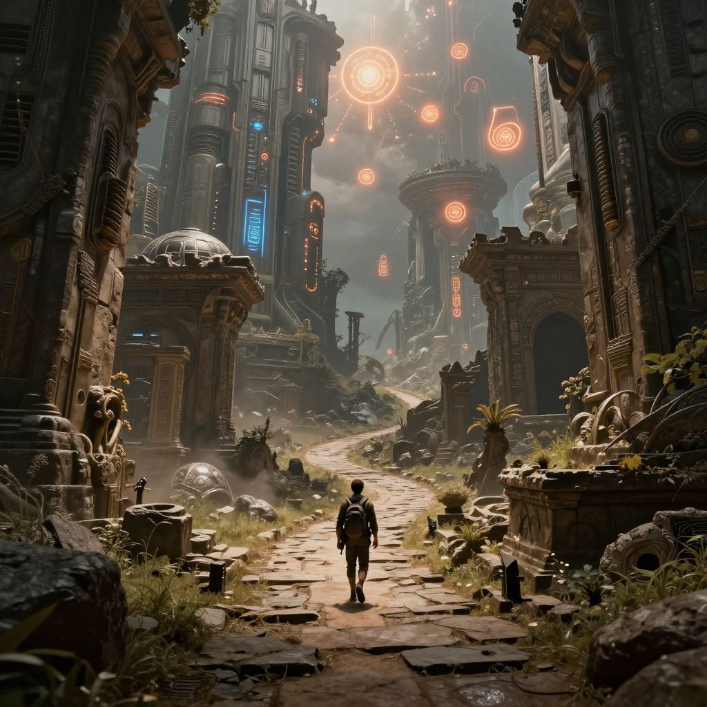 Digital art of a futuristic, ruins-filled alleyway with glowing neon orbs, a lone figure in dark clothing walking towards towering, ancient-tech structures. Over