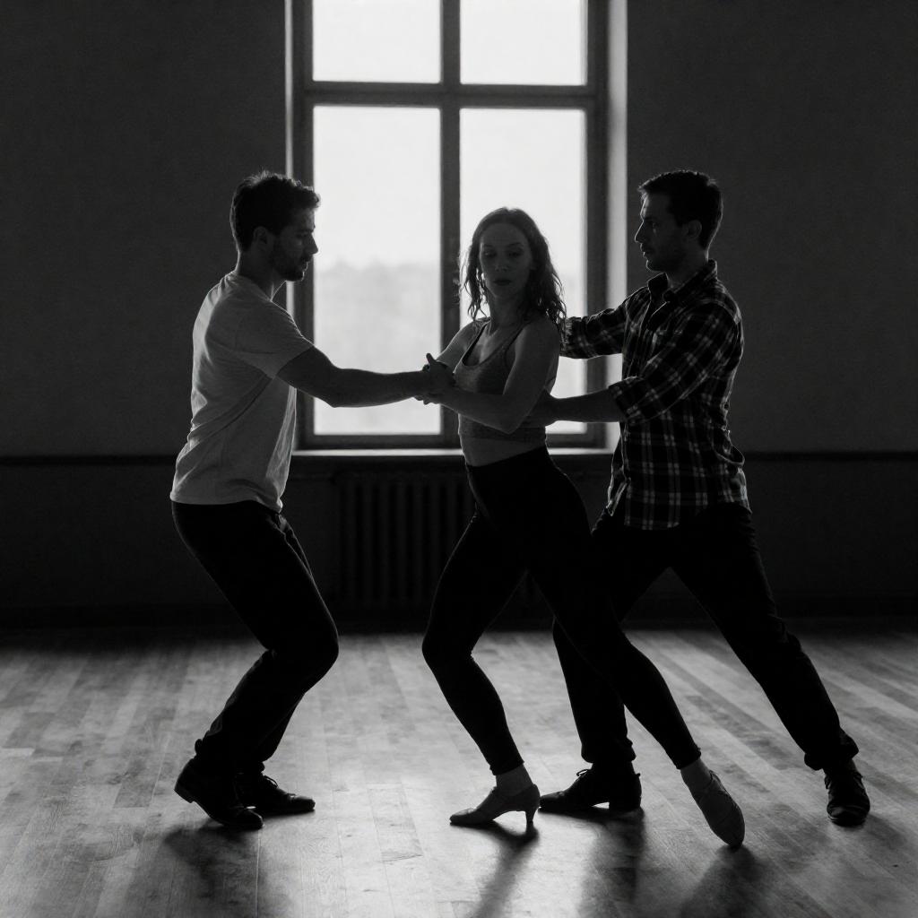 Black-and-white photograph of three people dancing in a dimly lit room. Two men, one in a light shirt and dark pants, the other in a plaid shirt and dark pants, dance with a woman in a sleeveless top and dark pants. All three have intense expressions. Large window in background, wooden floor, dark walls. Dancers' poses: one man leads with left arm, woman in center, other man supports her back. Reflections on floor.