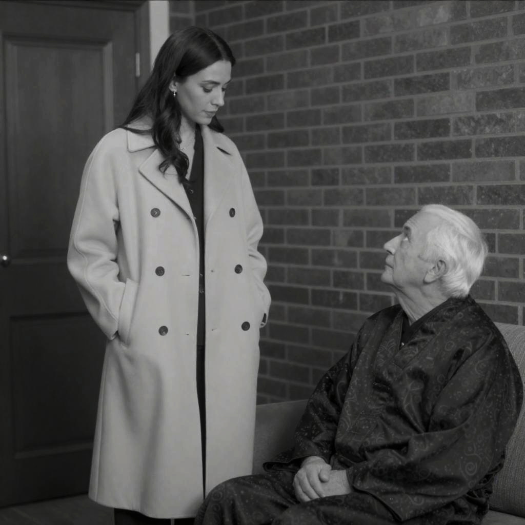 Black and white photograph of a woman in a long, light-colored coat standing with hands in pockets, looking down, next to an older man with white hair, wearing a dark patterned robe, sitting on a couch, looking up at her. Brick wall and wooden door in the background.
