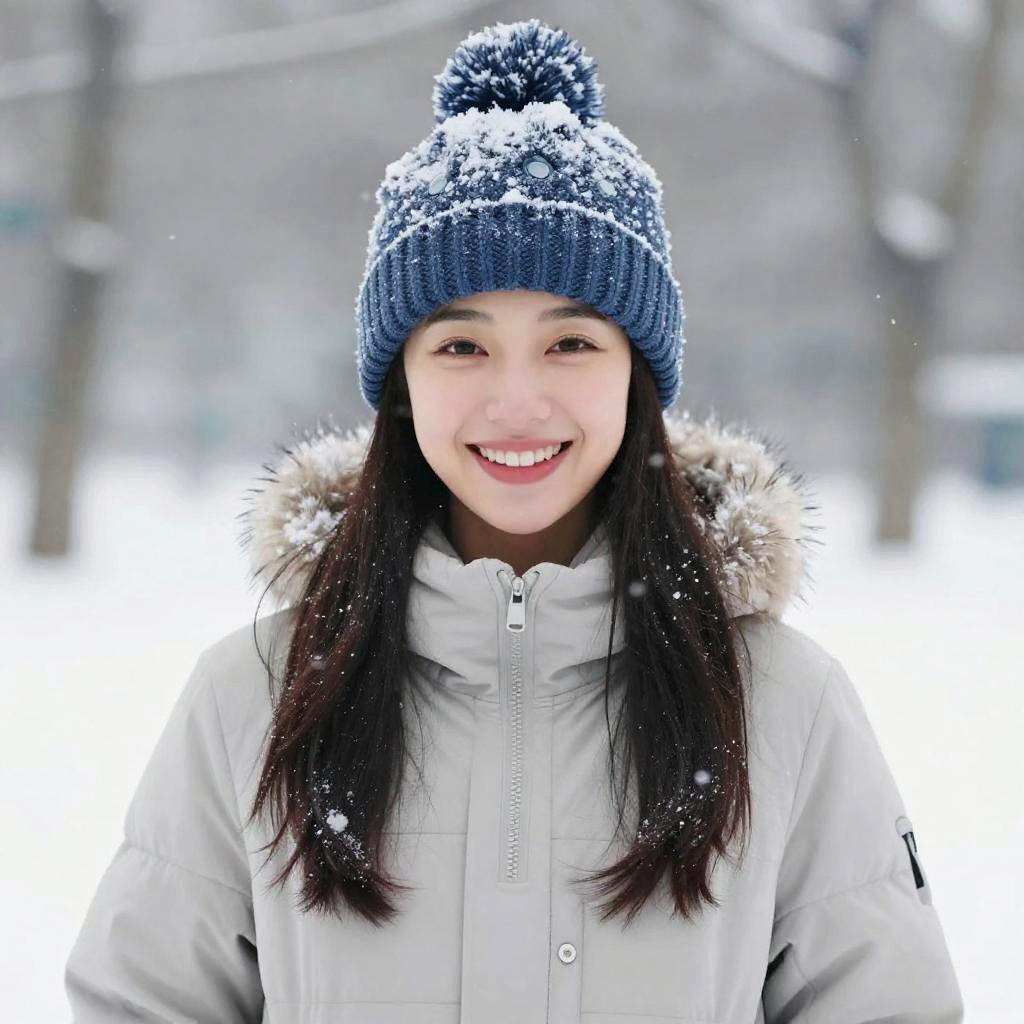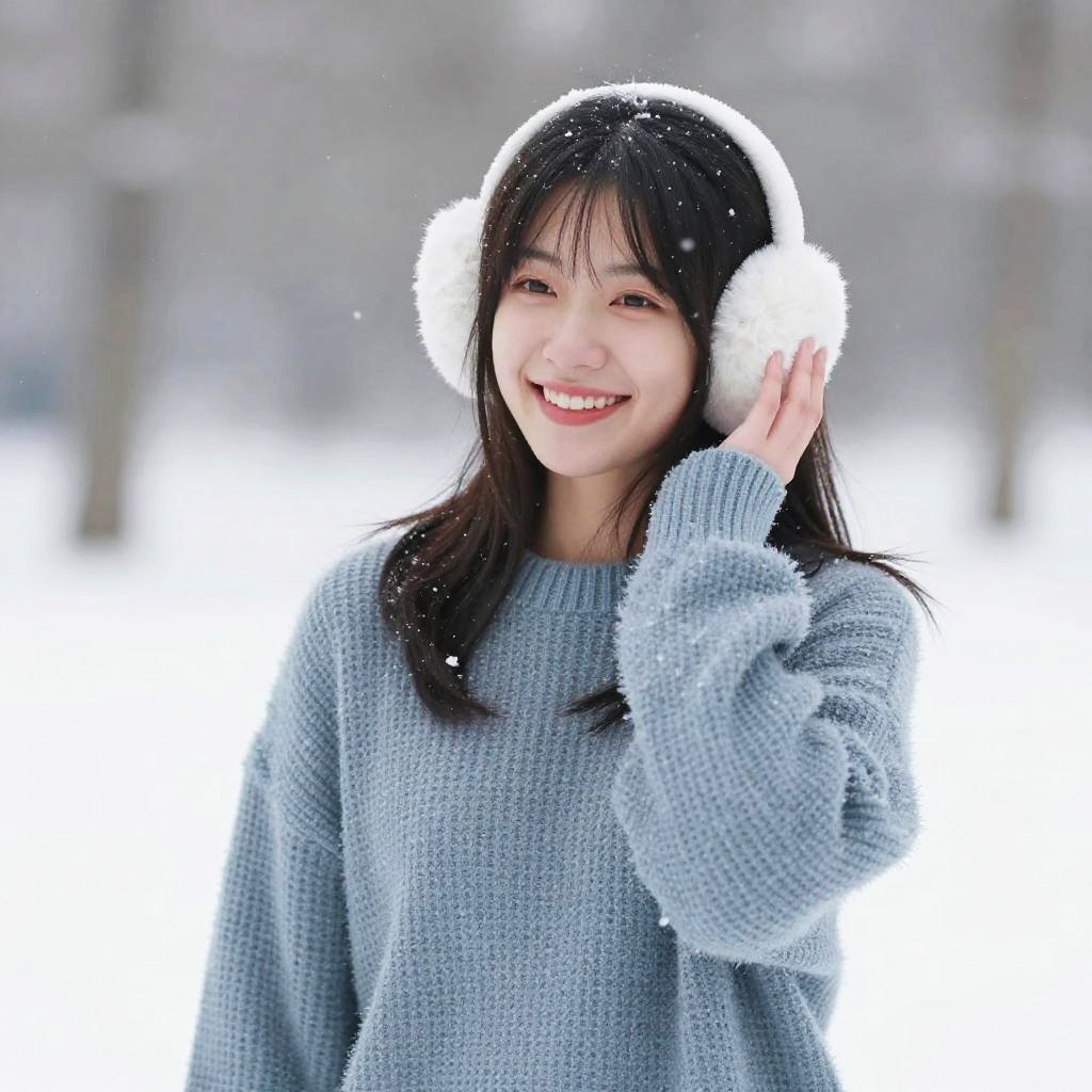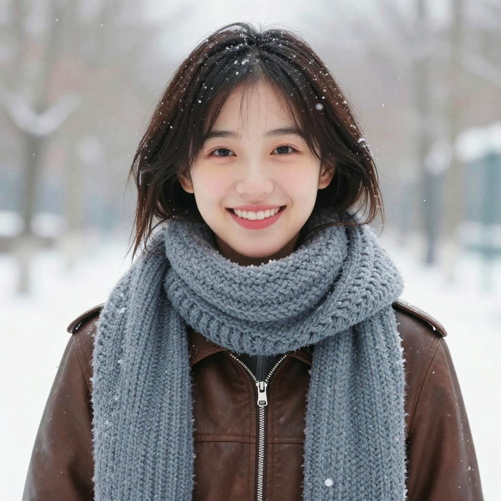 A happy young woman smiling and wearing a long woollen cardigan with a colorful scarf in snowy weather, soft natural lighting, snowflakes falling around, winter atmosphere, blue and gray color tones