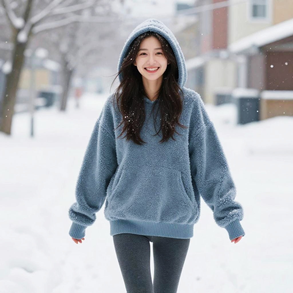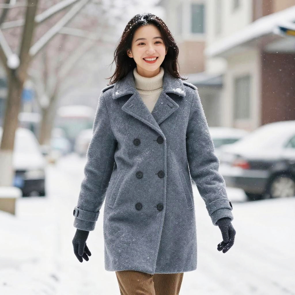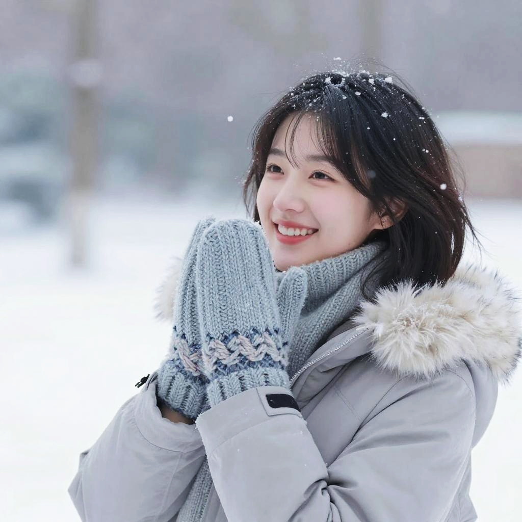 A happy young woman smiling and wearing a long woollen cardigan with a colorful scarf in snowy weather, soft natural lighting, snowflakes falling around, winter atmosphere, blue and gray color tones