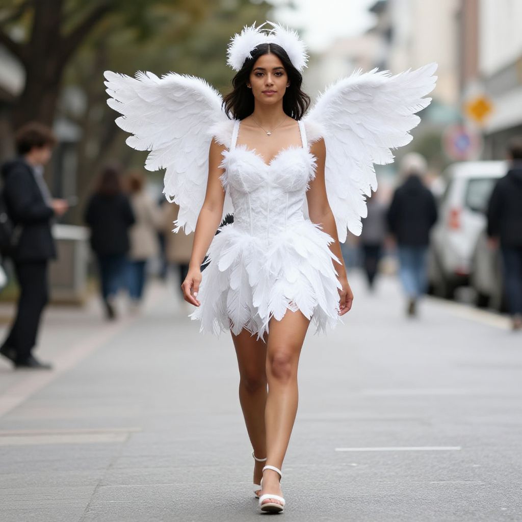 "White Feather Costume, woman in white feathered dress walking down a street"
