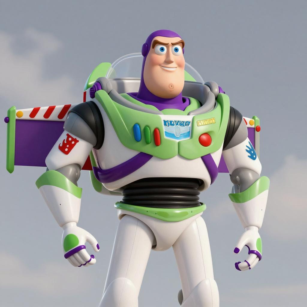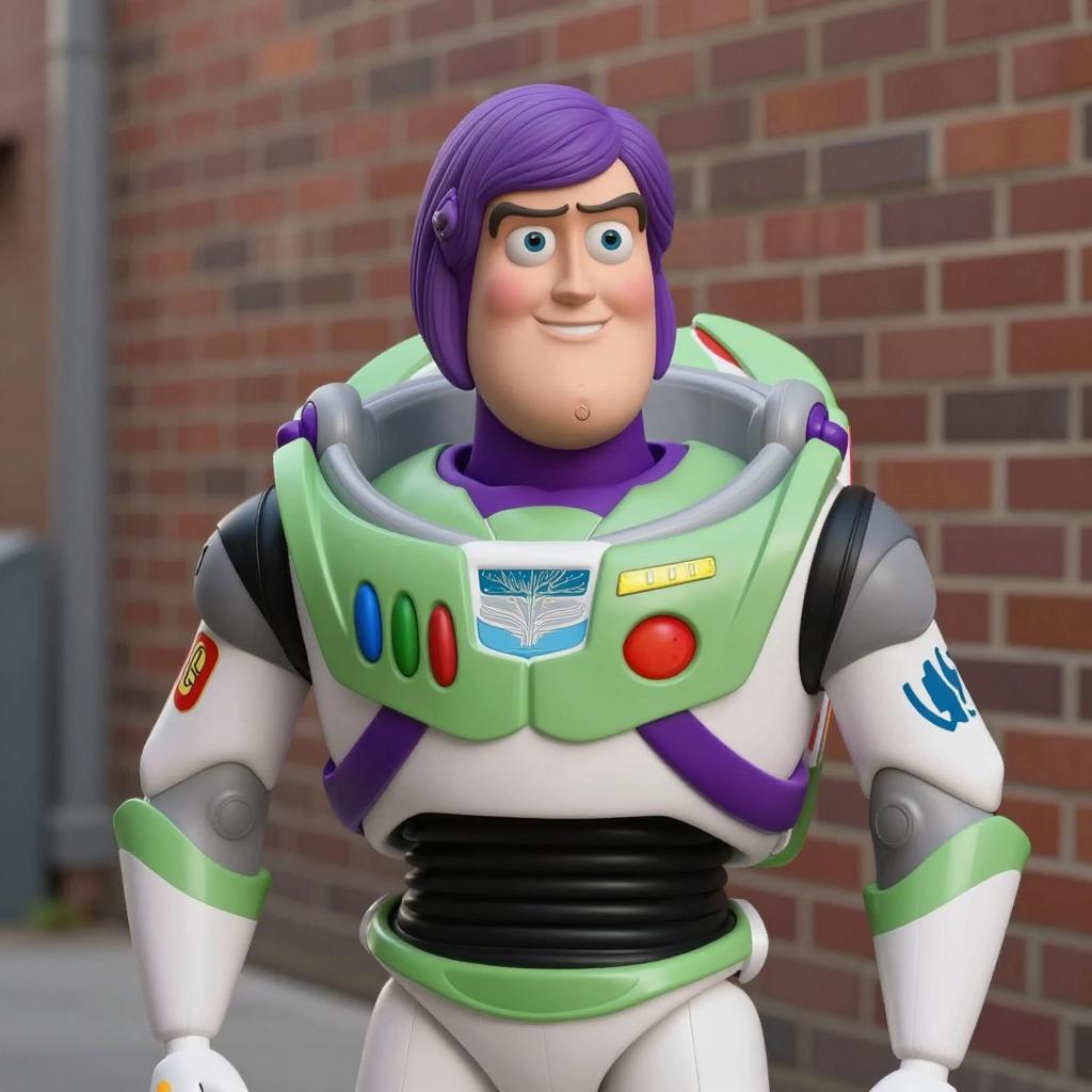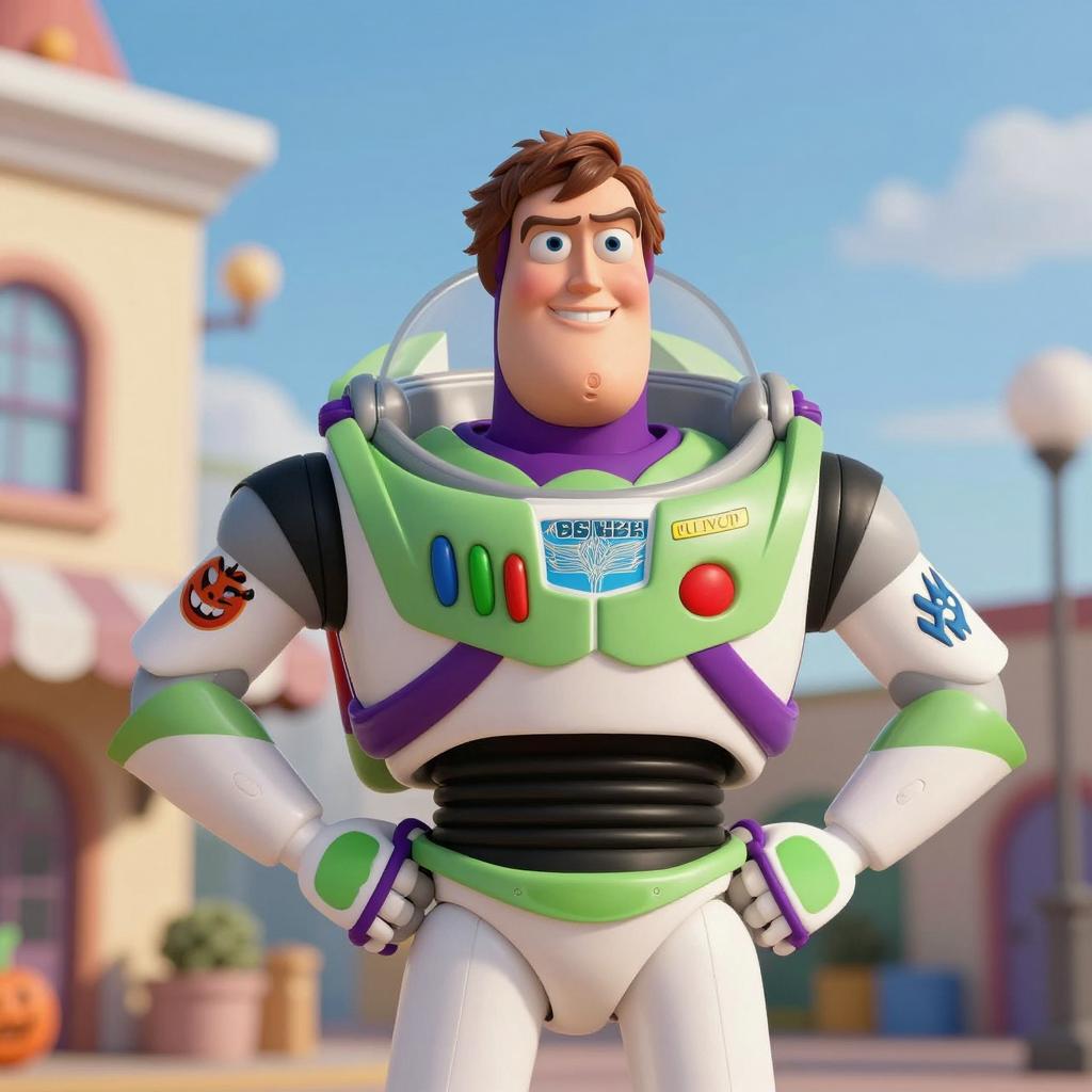 Buzz lightyear halloween, photograph of a young white man, short brown hair, smiling, wearing a Buzz Lightyear astronaut costume, hands on hips, daytime, outdoor, blurred background, building on left, clear blue sky, green, white, black, purple spacesuit, Buzz Lightyear badge, red button, green button, realistic CGI style, colorful, bright lighting, relaxed pose