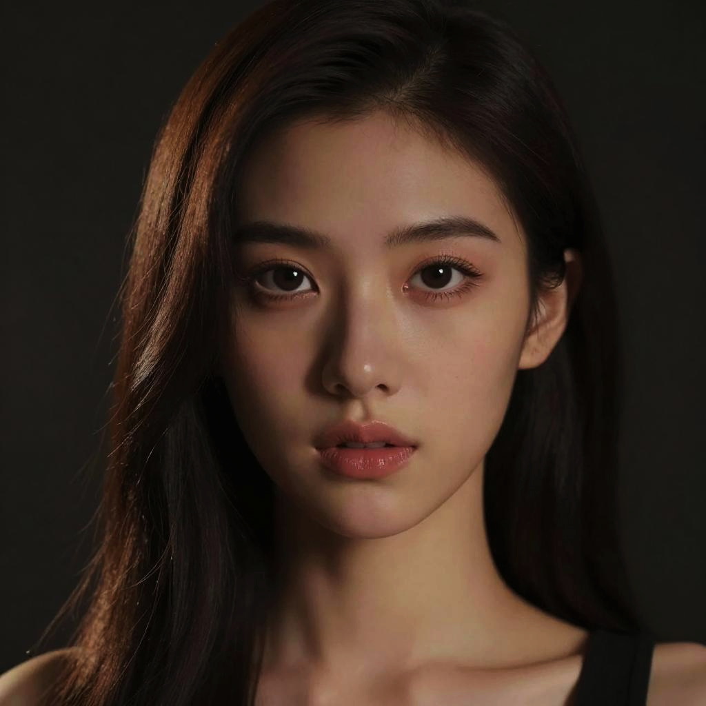 Photograph of a woman with dark hair in a messy updo, wearing a black, off-shoulder top, looking over her shoulder with intense eyes. Background includes a beige lamp, chair, and soft lighting. Warm, dim lighting. Her right shoulder and arm are exposed, with a black strap across her back. She sits slightly turned away, glancing back at the camera.
