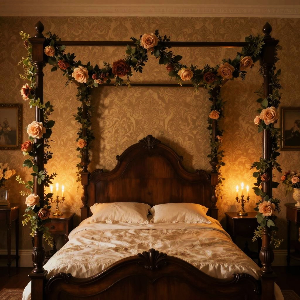 Garland above bed, vintage Victorian bedroom with ornate floral garland framing an antique wooden bed, warm golden tones, intricate wallpaper patterns, soft candlelight glow, classic and elegant style