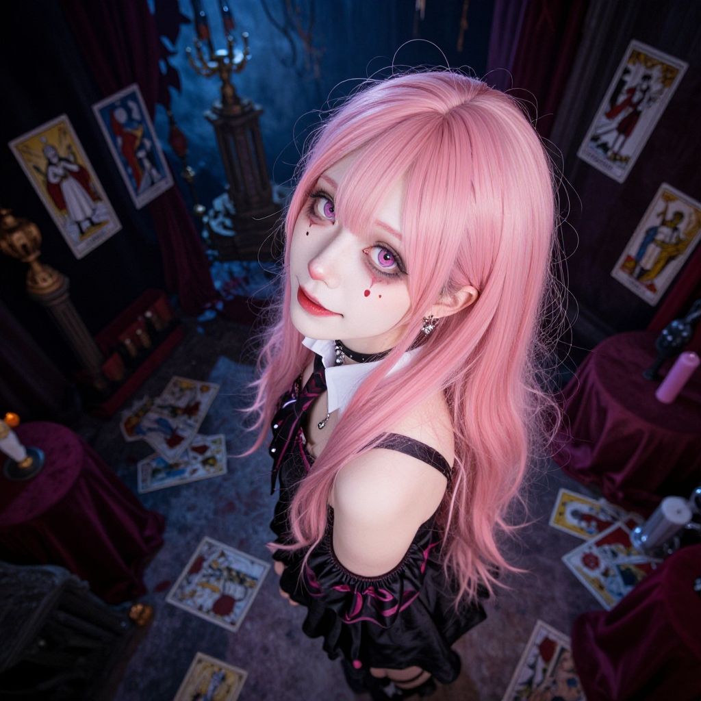 A vivid digital CGI image features a young woman with pale skin and long, pink hair, looking up with large, purple eyes. She wears a black off-shoulder top, a choker with a small pendant, and dark lipstick. Her makeup includes black star-shaped tattoos under her eyes. The background is a dimly lit room with dark wooden walls, scattered tarot cards, and tables draped in red cloth. A blue-lit candlestick is visible in the upper left corner, adding a mysterious ambiance. The image has a high-contrast, slightly surreal style.