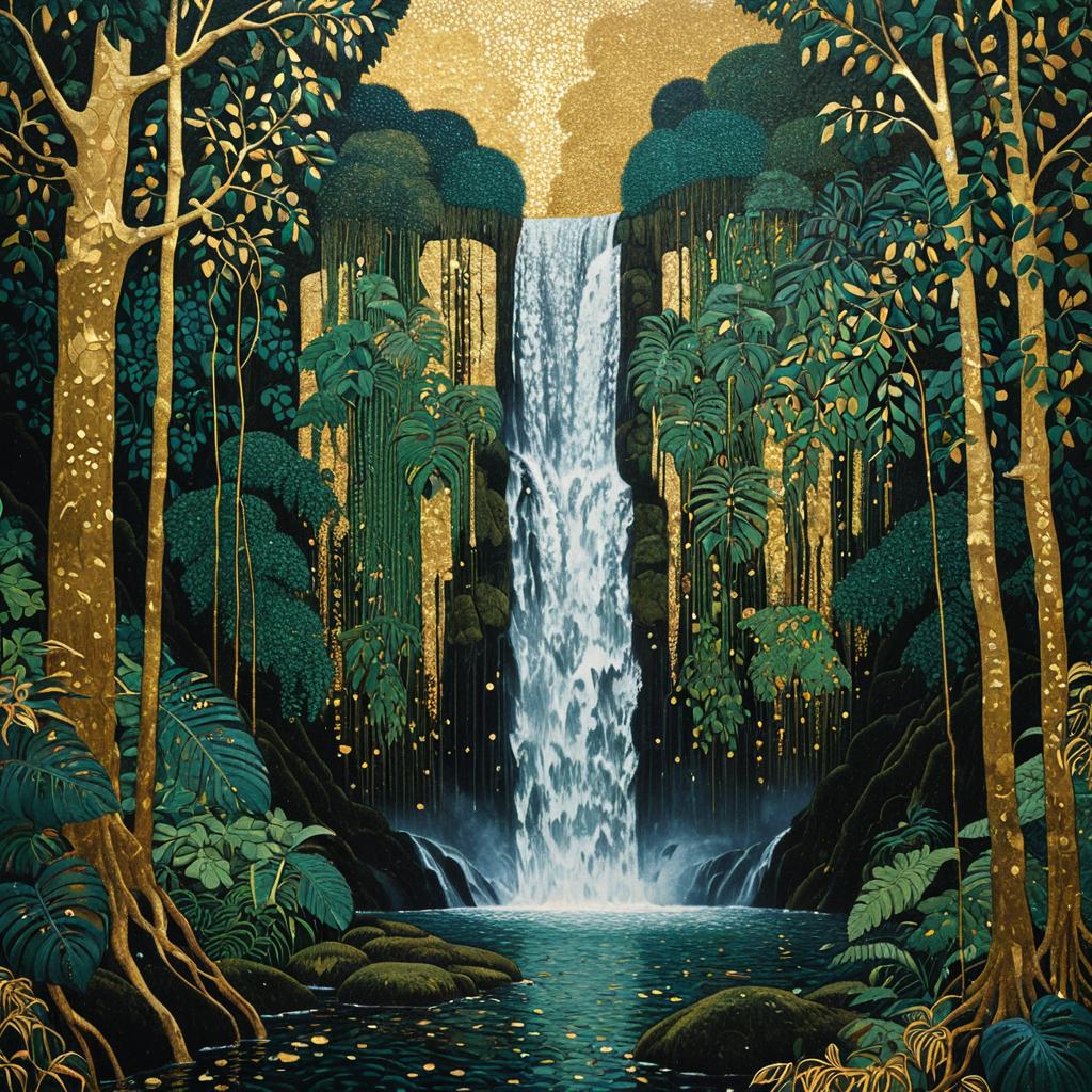 Detailed illustration of a tranquil seashore at dusk featuring a mosaic pattern texture with gold filigree highlights. The peaceful beach scene is adorned with seashells and driftwood on a pebble-covered shore, wavy ocean water reflecting soft sunlight, rocky outcrops in the distance, and quaint houses along the coastline. The artwork is inspired by the style of Claude Monet.