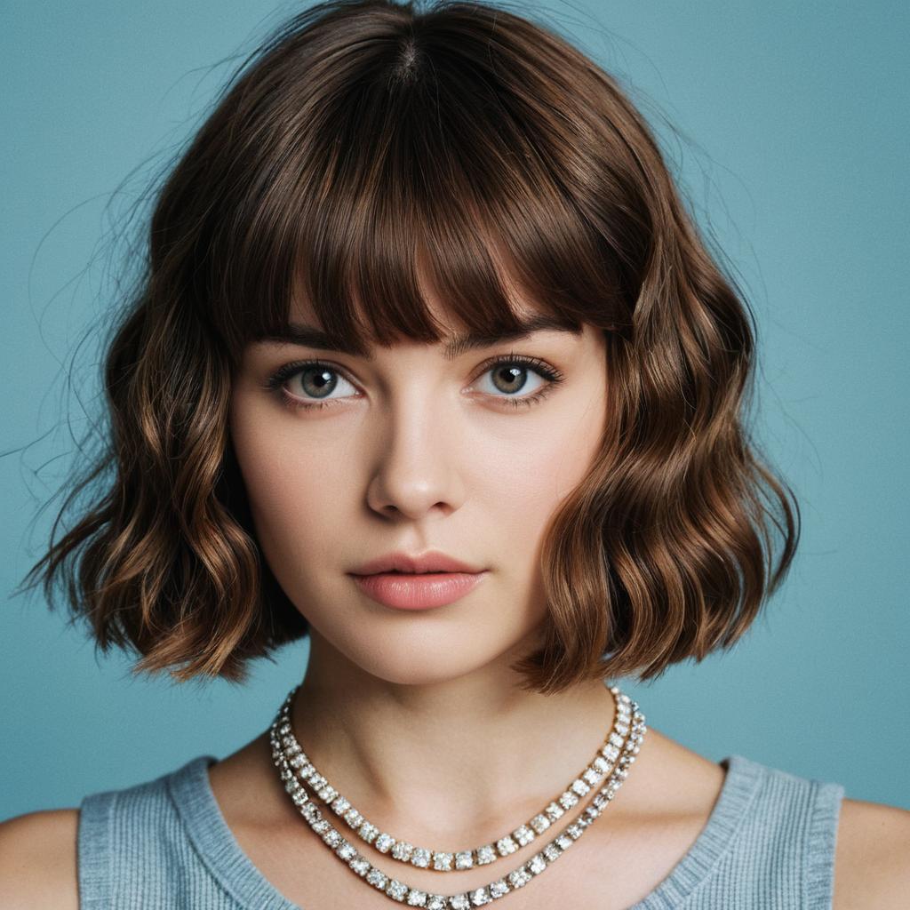 1girl, solo, short hair, brown hair, realistic, lips, green eyes, upper body, breasts, bob cut, choker, long sleeves, looking at viewer, dark, medium breasts, nose, necklace, jewelry, closed mouth, artist name, nail polish, blue eyes, watermark