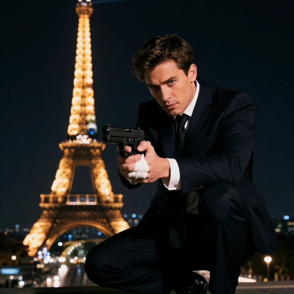 Man with short brown hair in dark suit, white shirt, and black tie, crouching, aiming a black pistol at the camera. Nighttime cityscape with illuminated Eiffel Tower in background. Intense expression, right hand wrapped in white cloth.