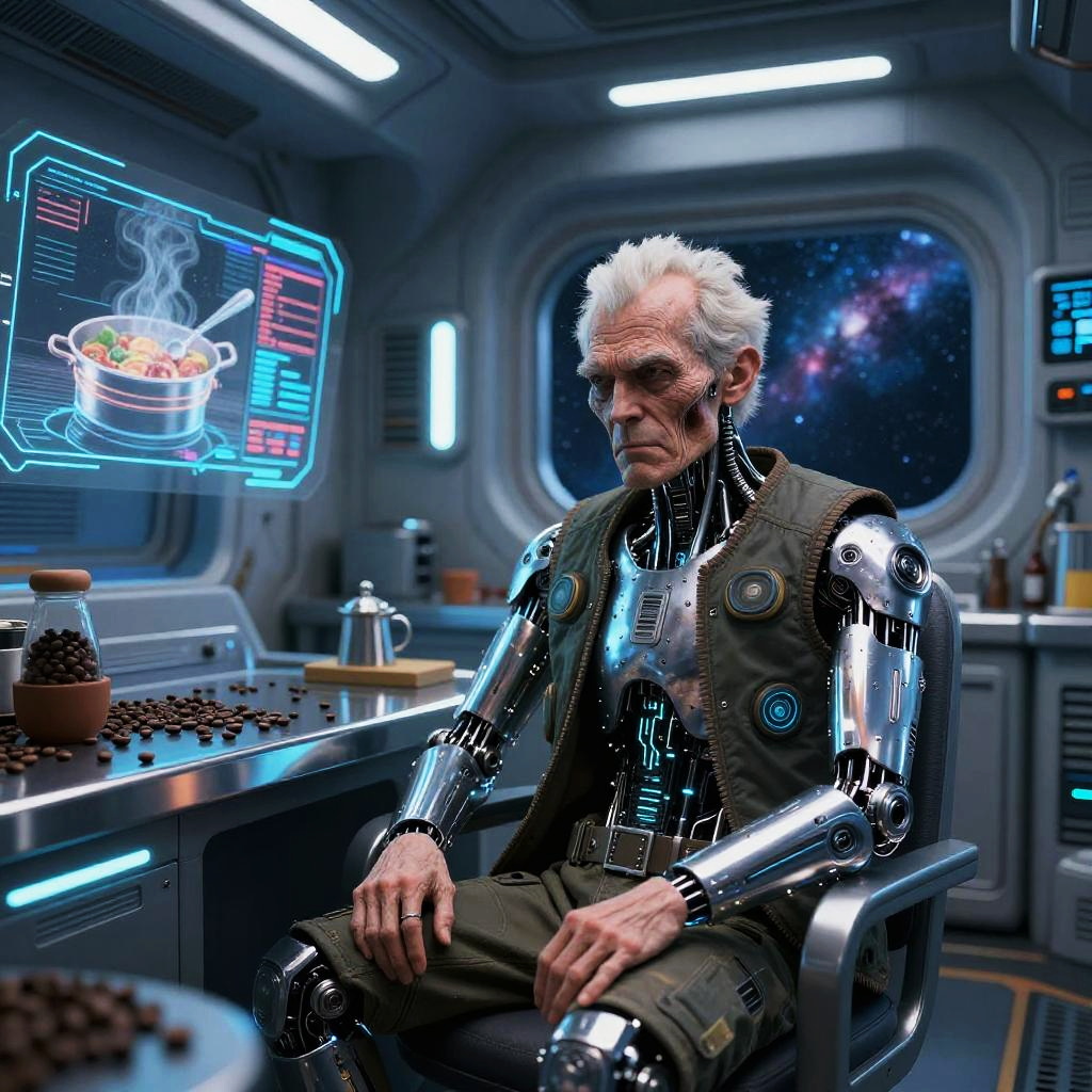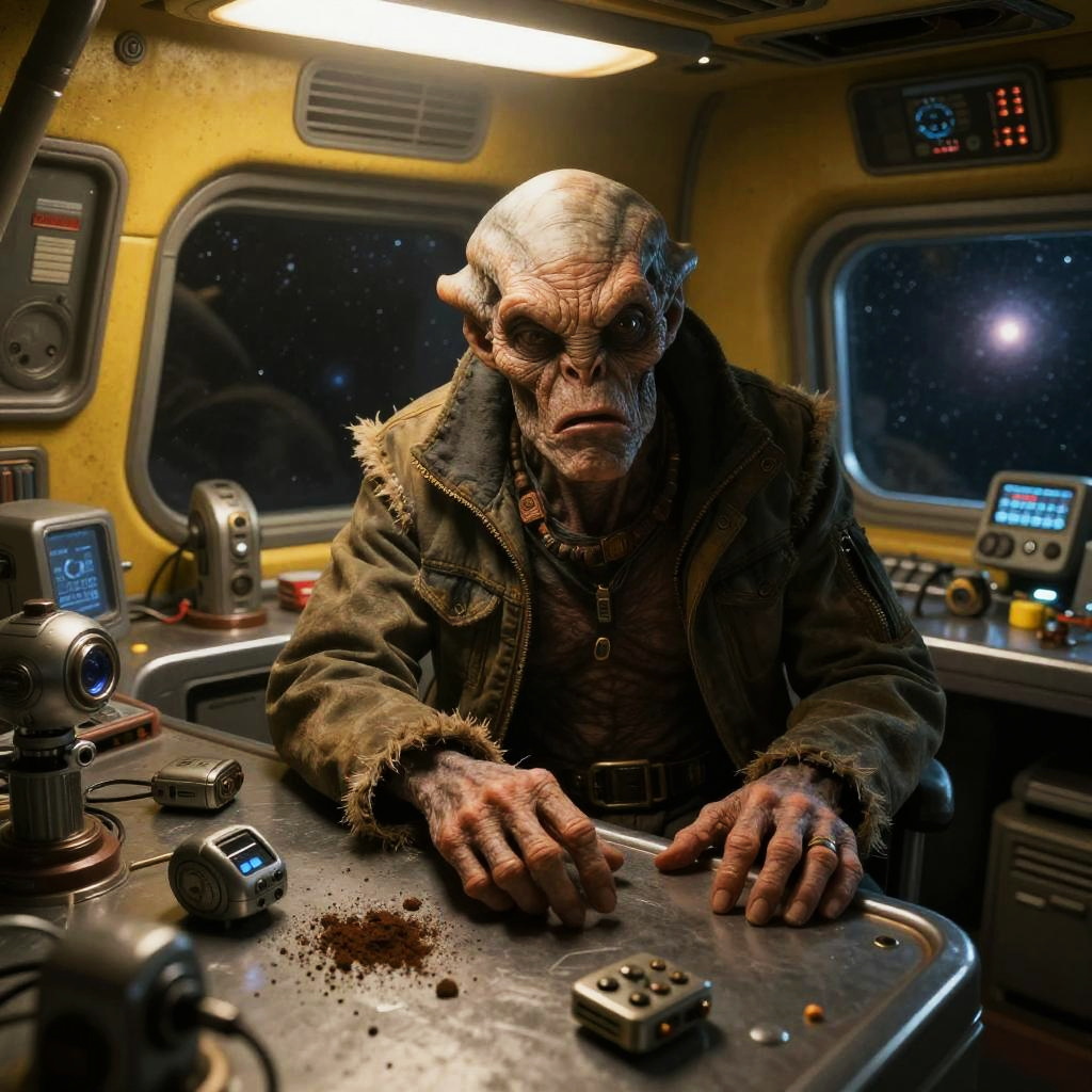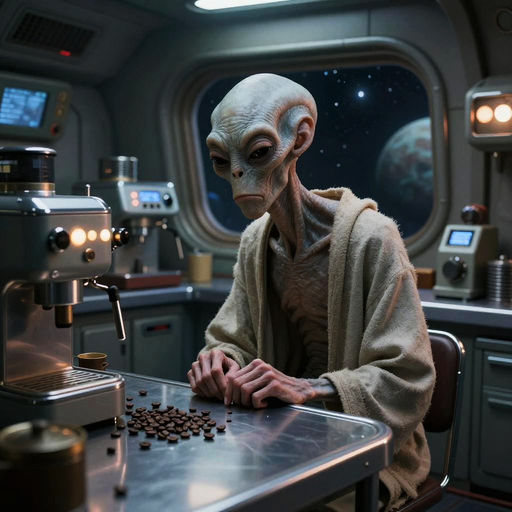 Wise elderly reptilian alien man, rough scaly texture with prominent age lines, quietly grumpy, eyes half-closed, small but packed spaceship galley with hanging utensils, soft golden ambient light with subtle shadows, worn but functional retro-futuristic coffee equipment, dark roasted beans scattered and partially crushed, matte metal surfaces faded with use, cluster of distant stars seen through round viewport, worn-in homely cluttered feel, frayed dark tunic with patches, futuristic appliances around, dim ambient lighting, metallic surfaces glinting, exhausted expression, cozy yet chaotic atmosphere, high detail and colorful tones
