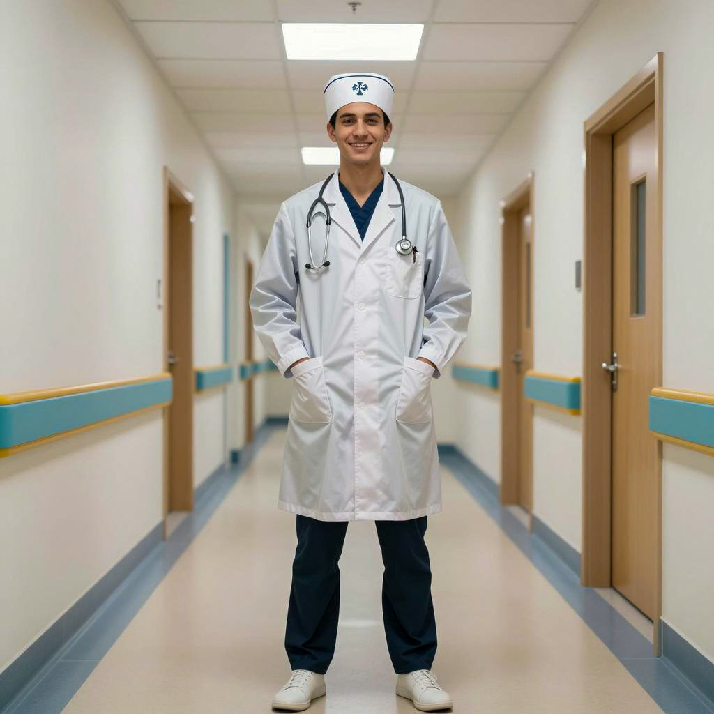 Doctor nurse costume, photorealistic, young male doctor, standing in hospital hallway, wearing silver lab coat, dark scrub pants, white sneakers, white cap with medical emblem, stethoscope around neck, hands in pockets, smiling, fluorescent ceiling lights, wooden doors on right, blue and gold wall trim on left, modern hospital corridor, daytime, professional attire, casual stance, symmetrical perspective, realistic lighting, clean environment