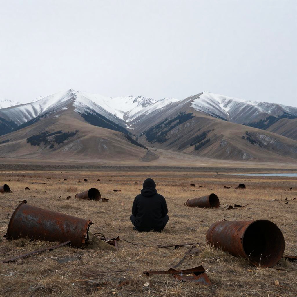 Photograph of a solitary person in dark clothing sitting on the ground among scattered, rusted metal wreckage in a barren, grassy field. Snow-capped mountains with patches of brown and gray terrain rise in the background. Overcast sky. Person's face not visible.