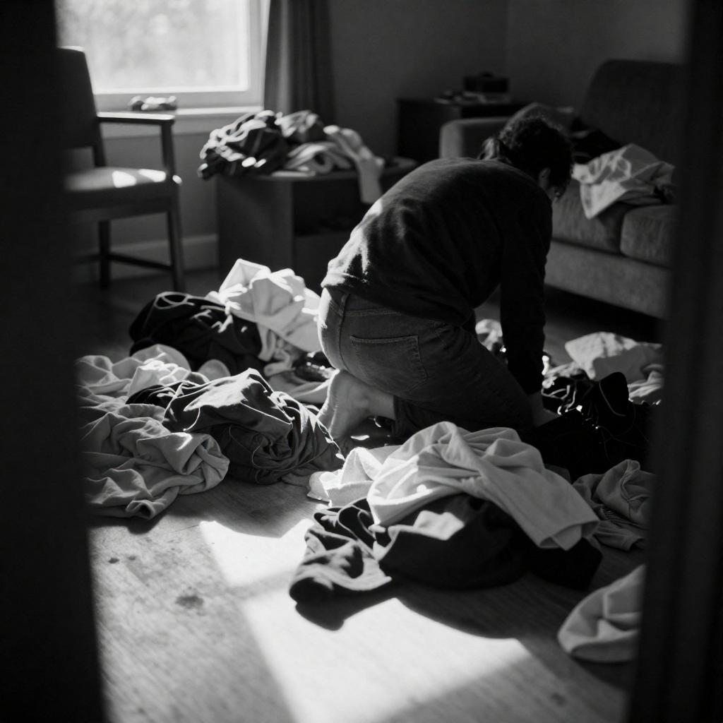 Black-and-white photograph of a cluttered living room with clothes and blankets scattered across the floor. A person, partially obscured by shadows, kneels amidst the mess. Sunlight streams through a window, illuminating the foreground. Furniture, including a chair and table, is visible in the background.