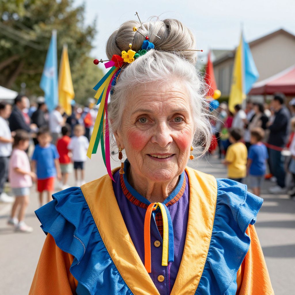 Realistic portrait of a spirited old lady with bright eyes and a rosy cheek, wearing a playful costume with a ruffled jacket and colorful headpiece, her hair arranged in a dramatic voluminous bun with pins and ribbons, standing in a sunny community parade setting with children and flags in the background.