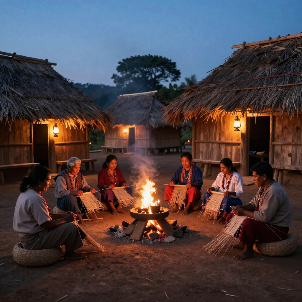 Nahua village scene at dusk, wooden huts with thatched roofs illuminated by oil lamps, villagers engaging in communal activities like weaving and storytelling, smoke from cooking fires, deep warm colors convey a sense of community and ancient tradition.