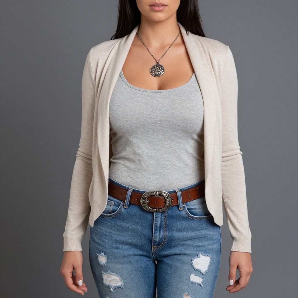 "Woman, casual, light beige open-front cardigan with draped lapels, heather grey tank top, blue distressed skinny jeans with white patchwork, brown leather belt with ornate buckle, silver pendant necklace.. Sexy. Pretty face and beаutiful eyes. Big breasts."