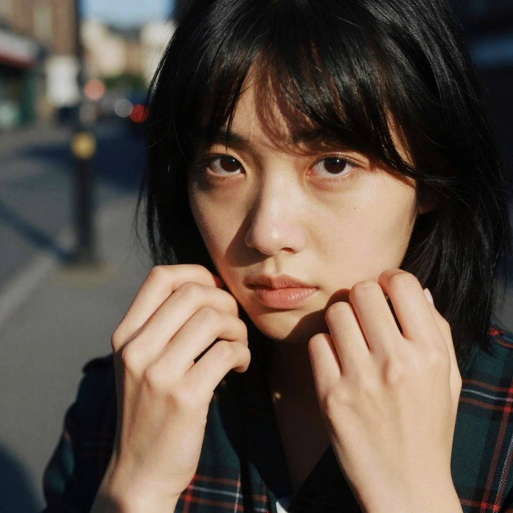 Film still, film grain, cinematic, raw photo of a cute Japanese woman, (best quality and best aesthetic) and (photorealistic:1.4) and (Realistic:1.4) and Detailed Skin Textures and detailed skin pores and high skin detail, Detailed facial features, blunt bangs, Outdoors, public places