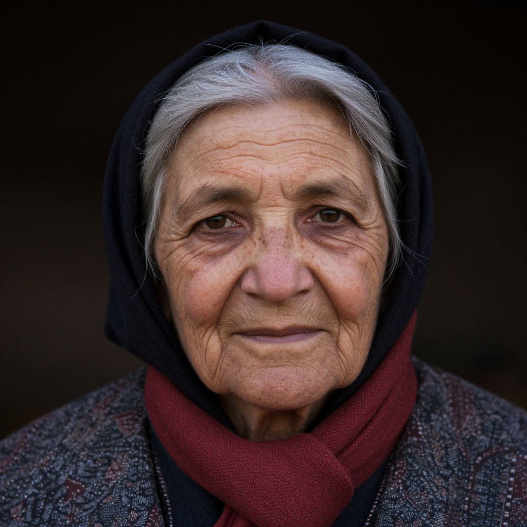 The image depicts an elderly woman with a serene and endearing gaze directed towards the camera. Her face is adorned with numerous wrinkles and age spots, indicative of a life well-lived. She is wearing a dark headscarf that contrasts with her light, silver-gray hair. The woman's attire includes a red scarf wrapped around her neck, adding a touch of warmth and color to her appearance. Her expression is calm and composed, with a slight hint of a smile, suggesting a gentle and kind personality. The background is dark and blurred, ensuring that the focus remains solely on the woman, making her the central figure in the composition. The overall lighting is soft, highlighting the texture of her skin and the intricate details of her clothing, creating a sense of depth and realism in the image.