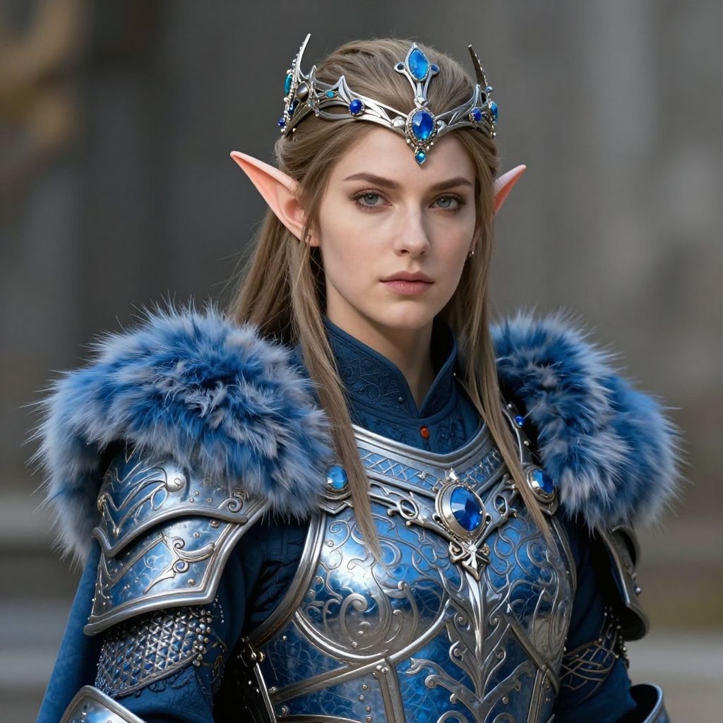 A high-quality CGI image of a young, fair-skinned female elf with long, brown hair and pointed ears. She wears an intricate silver and blue crown with a central gem, and matching armor adorned with blue fur trim. Her armor features detailed, reflective silver plates with blue gemstones, including one prominently on her chest. She has blue eyes and a serious expression. The background is blurred, suggesting an outdoor, medieval setting with stone structures. The image has a realistic fantasy style, with a focus on detailed textures and vivid colors.