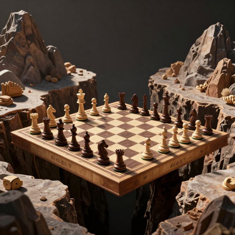 A surreal 3D-rendered scene depicts an ancient chessboard suspended above a deep chasm, its living piece figures engaged in a strategic duel, casting dramatic shadows as they bend the reality of their mystical, mountainous environment.