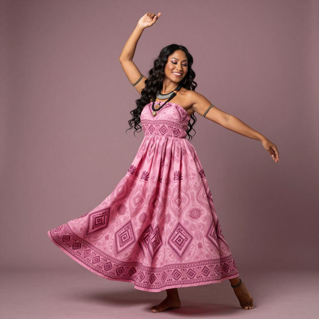 Portrait of a happy Maori woman with long wavy hair and slender figure dancing barefoot in a flowing, intricately patterned pink dress. She wears traditional-style jewelry including a necklace and arm bands, posed in front of a muted rosa studio background.