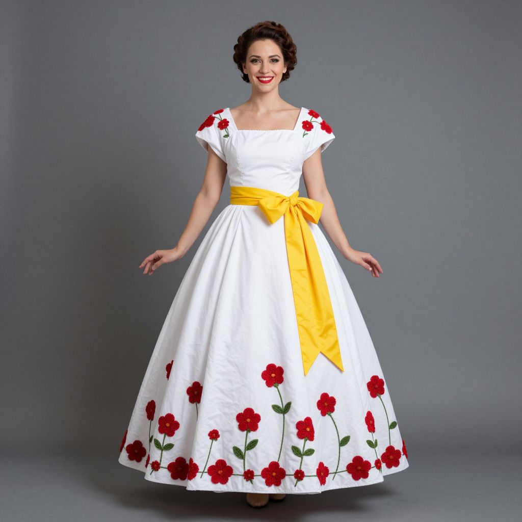 Photograph of a smiling woman in a vintage-style white dress with red flower embroidery, yellow sash, short sleeves, and a full skirt, standing