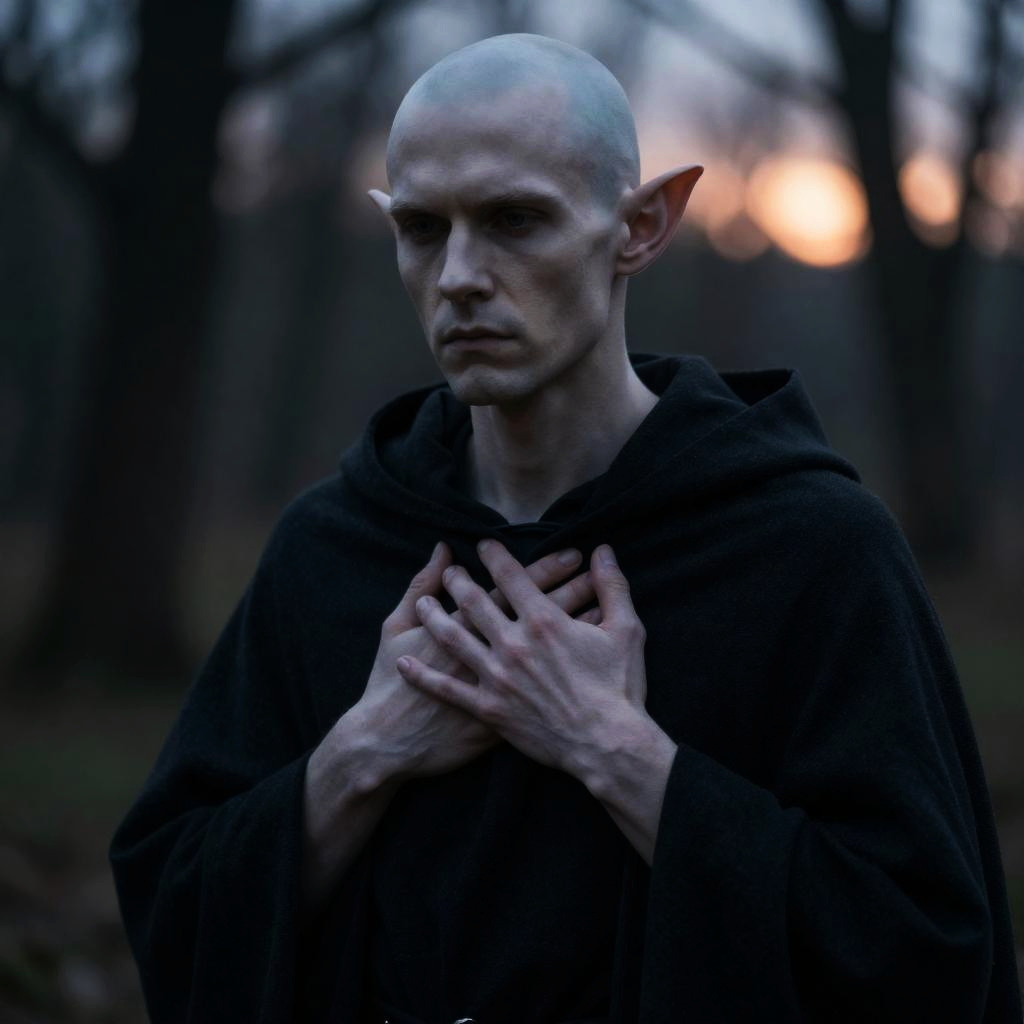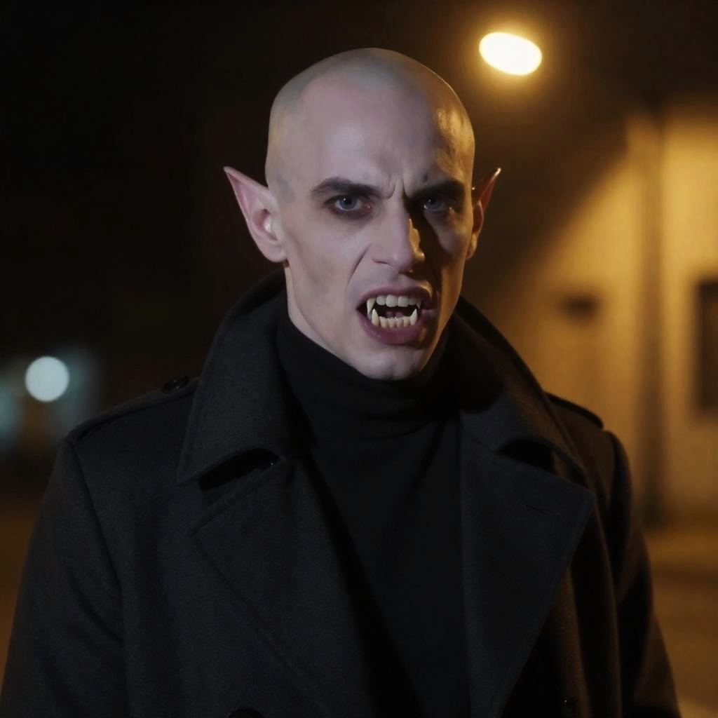 Bald, pale-skinned man with pointed ears, intense expression, open mouth showing fangs, wearing dark coat, nighttime setting, blurred yellow streetlights in background.