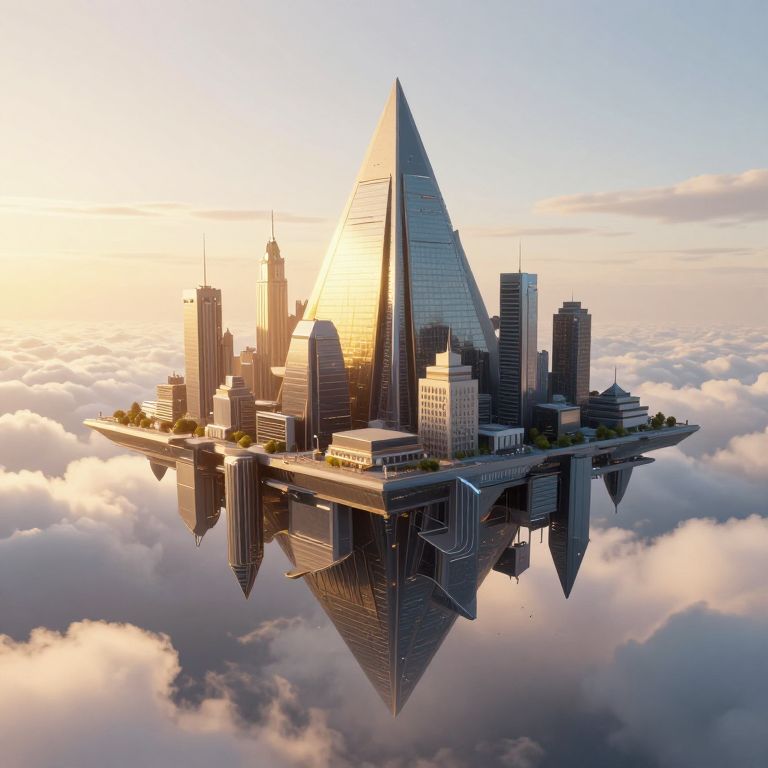 CGI image of a futuristic, floating cityscape with tall skyscrapers, including a prominent pyramid-shaped building, reflected in clouds, bathed in