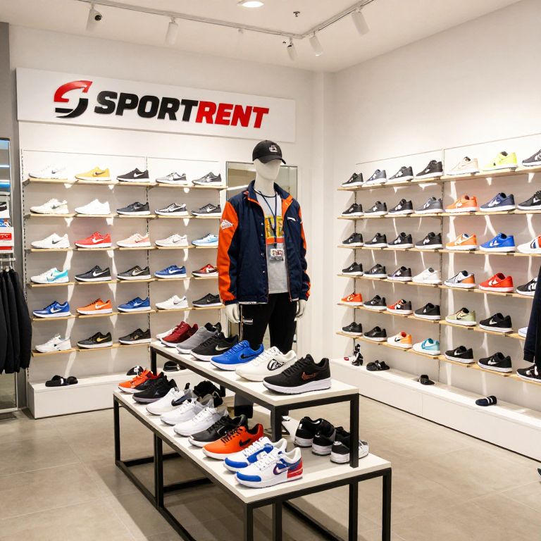 Well-lit SPORTRENT store interior showcasing a variety of colorful sneakers neatly arranged on multiple shelves and tables, with mannequins displaying jackets and a prominent logo above the entrance.
