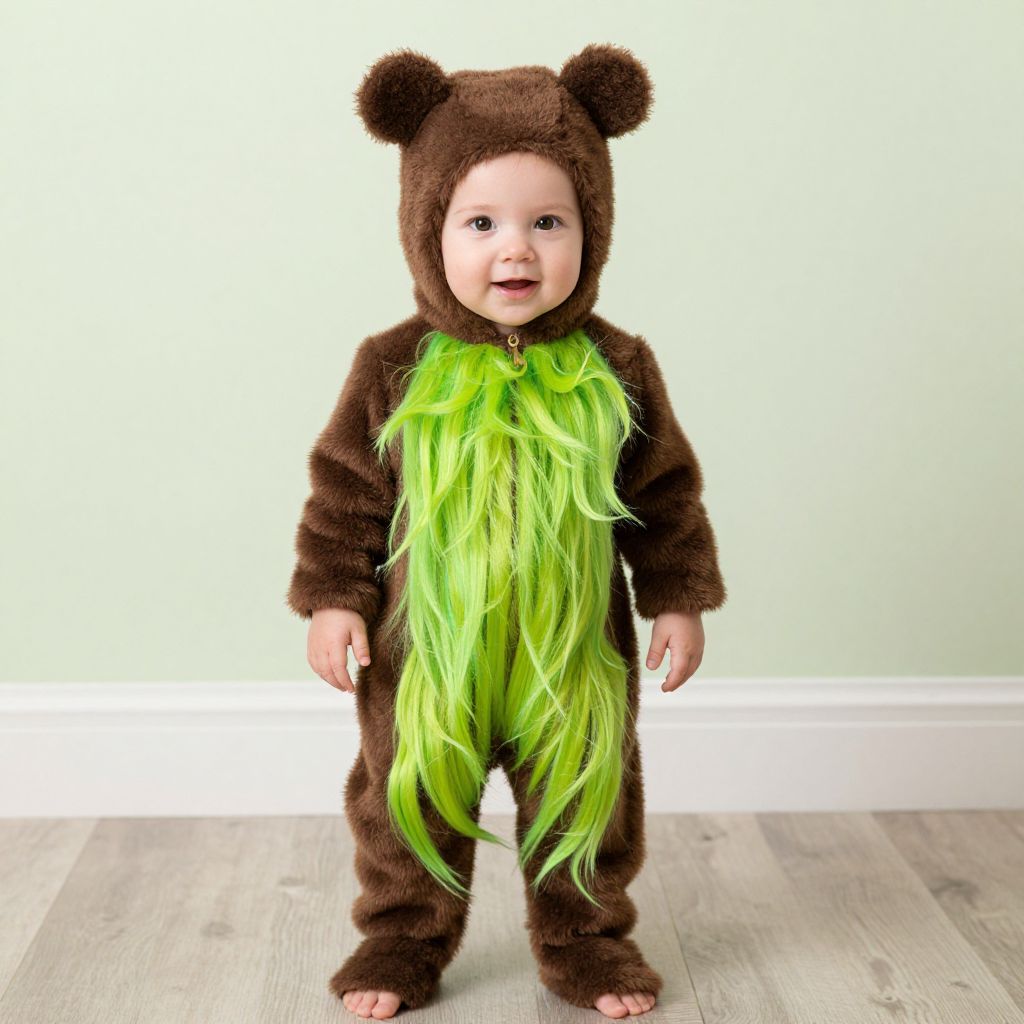 Toddler Slimer Costume, baby in a brown bear costume standing up