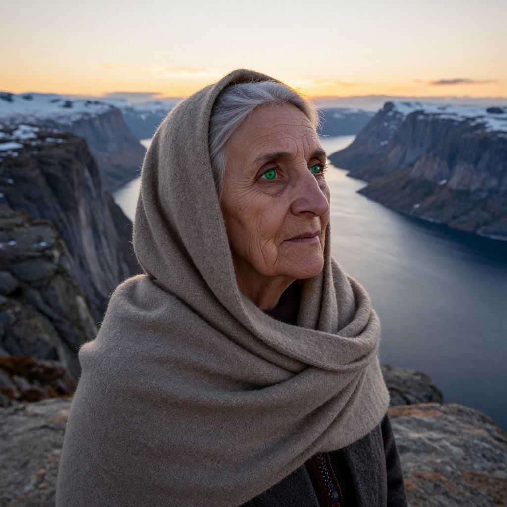 Visualize a super-realistic portrait of a wise Middle Eastern woman in her late 60s, showcasing weathered skin and captivating emerald eyes against rugged fjords. Bathed in the golden light of an Arctic sunset, she stands alone on a windswept cliffside, her gaze fixed upon the vast horizon, contemplating time's passage. Captured from an unusual bird's-eye perspective, the intricate folds of her traditional woolen shawl and life's fine lines etched onto her face evoke resilience and introspection. The photorealistic detail captures the atmospheric cold Scandinavian landscape, enveloping her stoic figure in ethereal glow.