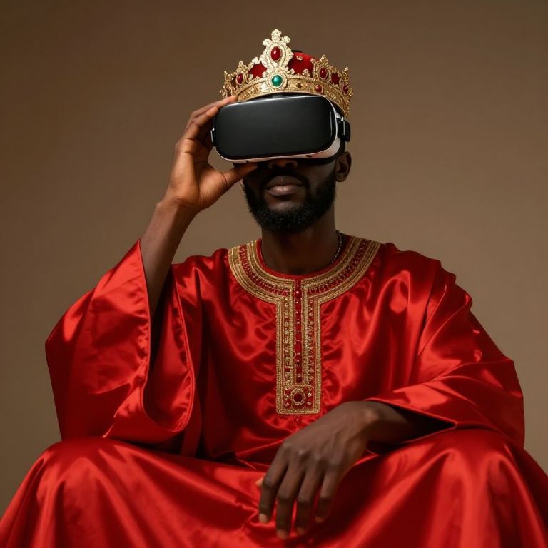 Portrait of a regal African man dressed in a luxurious red silk robe with gold embroidery, wearing an ornate African-style crown and using a virtual reality headset. The image captures a blend of traditional royal attire and modern technology, highlighting cultural heritage and futuristic innovation.