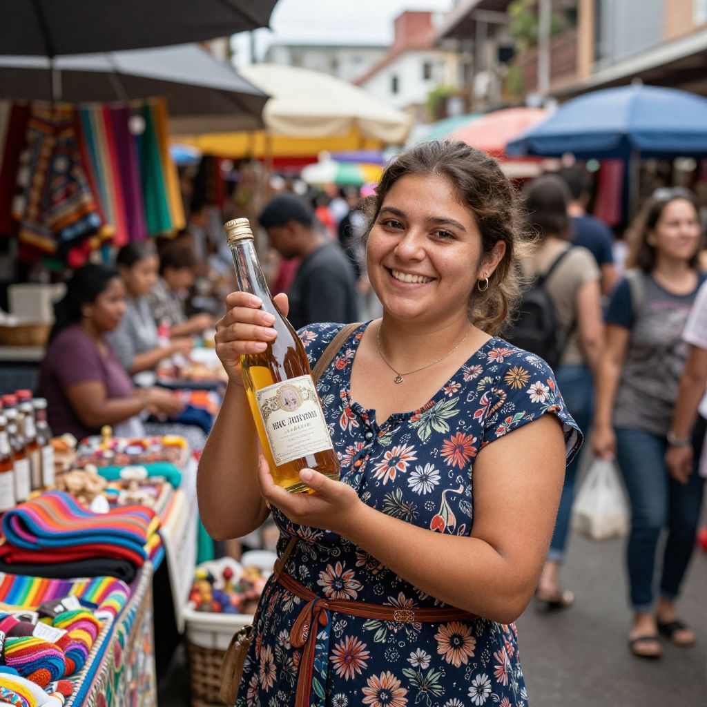 In the vibrant hum of a bustling marketplace, a woman cradles a bottle of laughter distilled from shared joy, her smile radiating warmth amidst the symphony of colors, scents, and stories that weave the fabric of community.