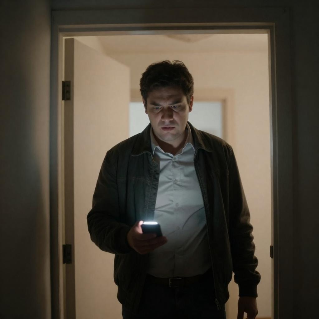 Photograph of a dimly lit room. Foreground: man in white tank top, short dark hair, neutral expression. Background: naked man standing, holding a glass, medium build, circumcised, slight smile. Partially visible man in left foreground, blurred. Shelves, plant, curtain in background. Wood floor, green patterned wallpaper.