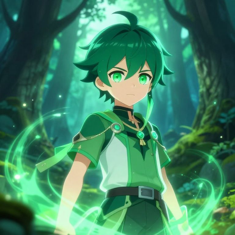 This digital anime-style artwork depicts a young male character with white hair and blue eyes, standing in a mystical forest. He wears a white and blue outfit with black gloves, gold and blue ornate armor on his shoulders, and a blue and gold sash with a green gem. The background features towering trees, glowing fireflies, and illuminated runes on the tree trunks, creating a magical atmosphere. The character's expression is serious, and he holds a sword at his side. The forest floor is adorned with greenery and small blue flowers.