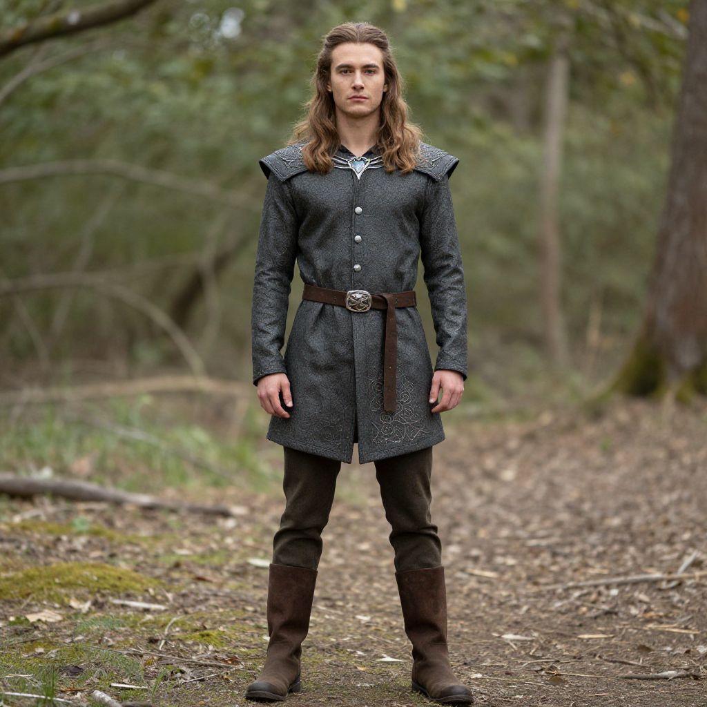 "lord rings fairy costume, solo, realistic, outdoors, male focus, long hair, 1boy, full body, standing, nature, boots, forest, blurry background, brown hair, looking at viewer Realistic photo of casual sexy person with pretty face"